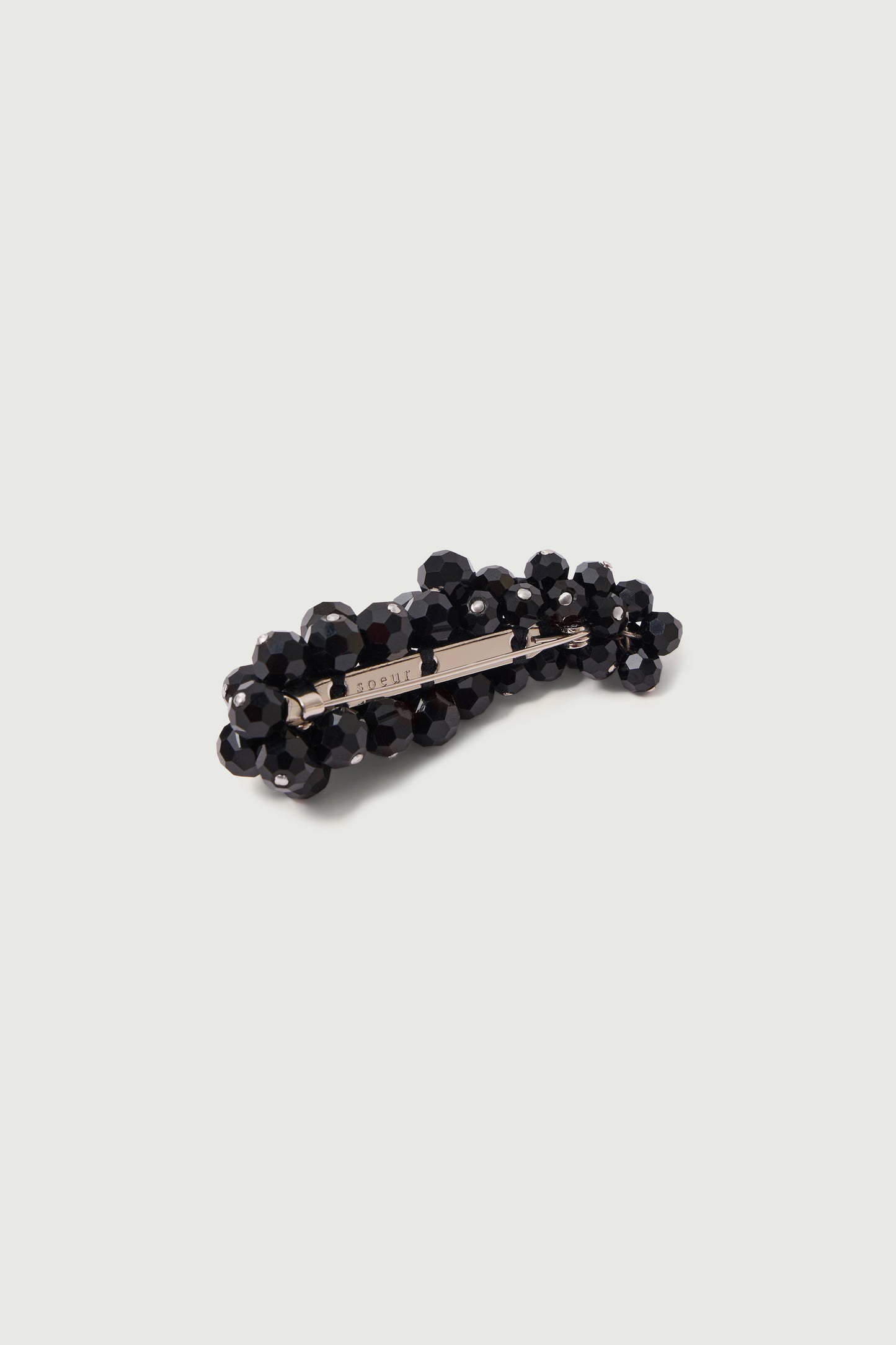 MARY is a brooch made of black faceted glass beads reminiscent of a cluster idea. It can be worn in a variety of ways, on the collar of a shirt or on the breast pocket of a blazer, and will give your silhouettes a distinctive touch.