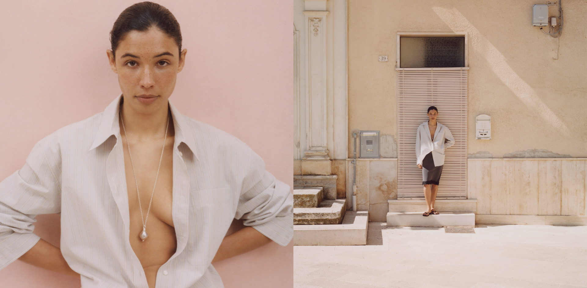 L’été s’habille de teintes brunes et pastel, effleure la peau sous l’ampleur d’une chemise en popeline entrouverte, la désinvolture d’un foulard noué en top ou la délicatesse d’une robe en soie. La collection et ses textures se révèlent à travers des silhouettes sculptées par une lumière languissante.