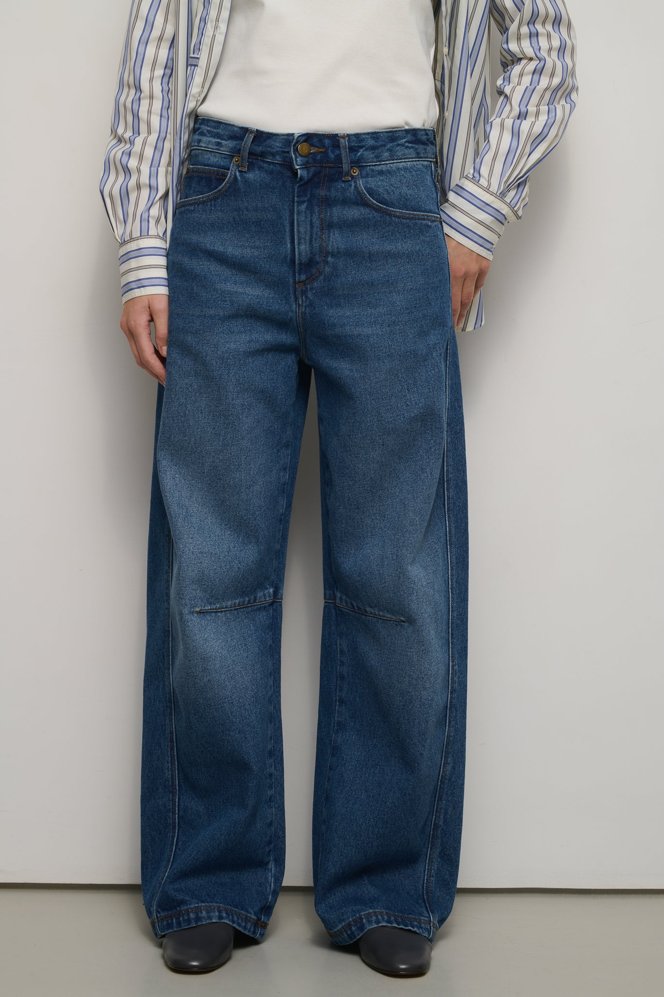 ELIOTT est un pantalon en toile de jean à la coupe ample et féminine. Le dessin courbe de sa jambe qui affine la taille, sa teinte bleu offrent un style qui associe le casual à l’élégance.