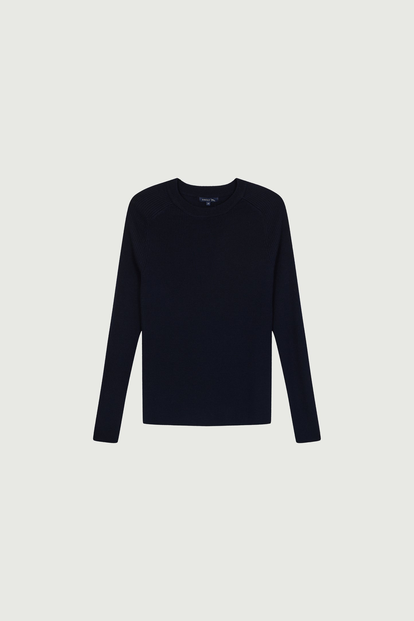 VERONA est un pull col rond en maille côtelée extensible à la coupe près du corps. Il peut être porté à même la peau ou superposé à une chemise longue. Il fait partie de notre ligne de tricots brodés du monogramme "S". Cette version est en laine mérinos fine et chaude. Une version d'été tricotée en coton et lin existe également.