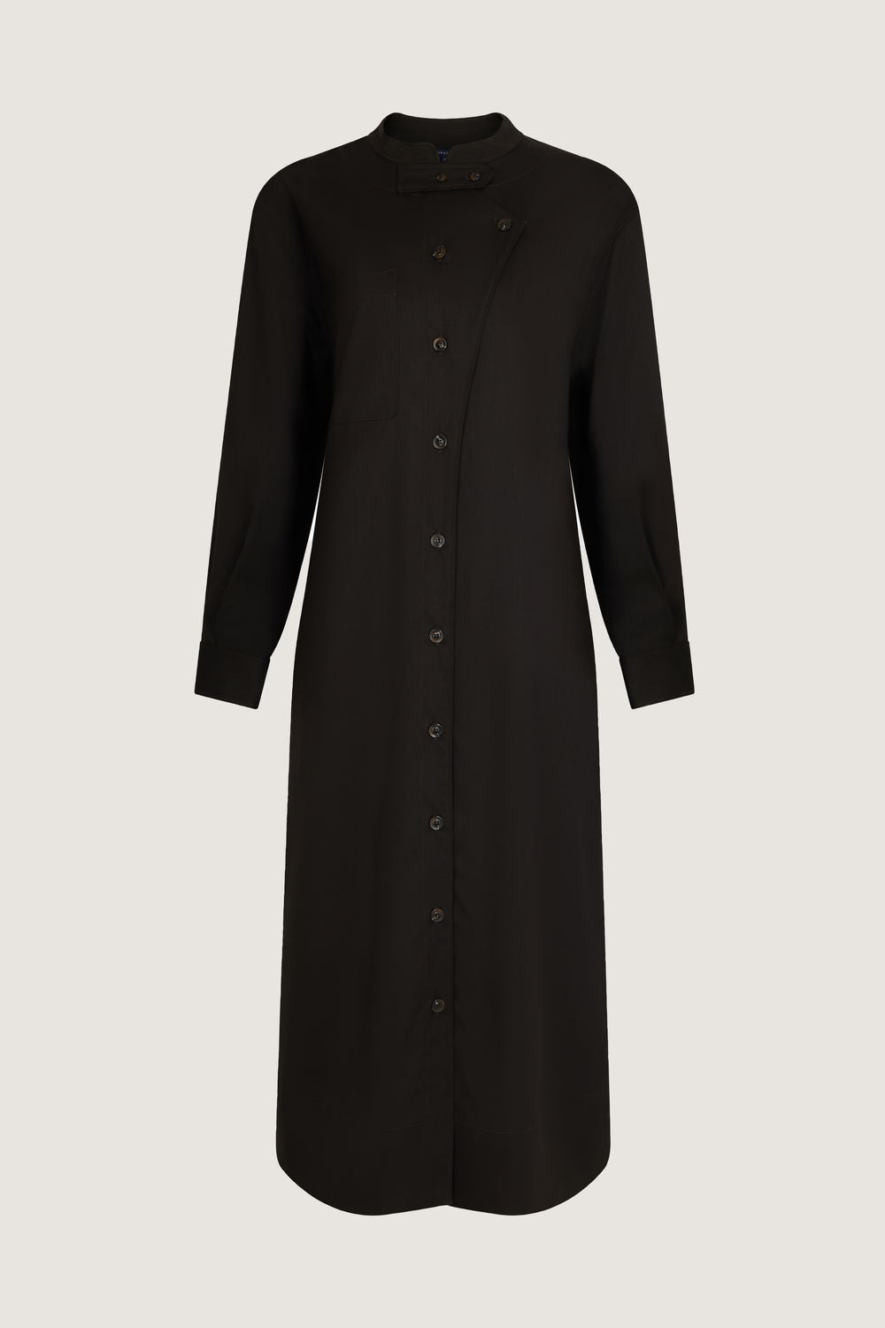Robe en gabardine de laine légère - Coupe longue et volume droit, se porte avec ou sans ceinture- Encolure ronde- Ouverture boutonnée asymétrique devant- Patte de serrage à l'encolure- Manches longues avec poignets de chemise boutonnés- Une poche poitrine plaquée- Poches inserées dans les coutures côté- Ceinture amovible